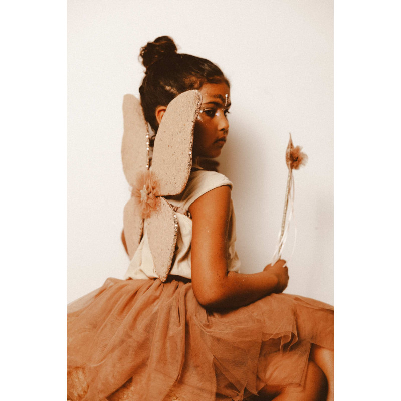 Premeňte svoje dieťa na nádherného motýľa s neprehliadnuteľnými krídlami Glitter Butterfly! Tieto ľahké krídla sú pokryté hnedými trblietkami, ktoré v svetle jemne žiaria. V strede sú spojené tylovou dekoráciou a jemnej zlatej hviezdičky. Pohodlné saténové popruhy zabezpečujú, že krídla dobre sedia a neobmedzujú v pohybe.