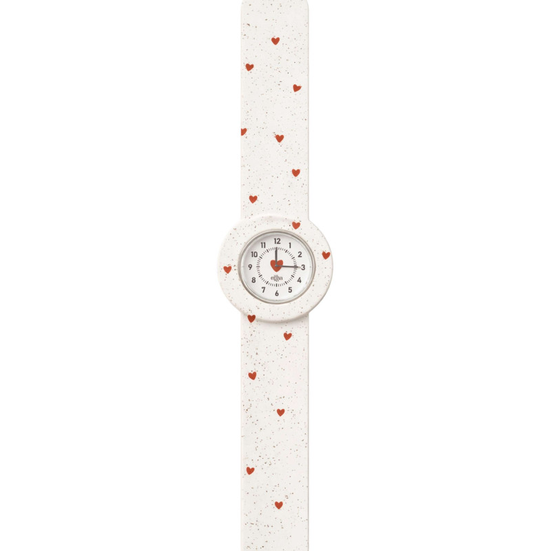 Svetlý remienok s červenými srdiečkami je vyrobený zo 100 % medicínskeho silikónu – je mäkký, príjemný na dotyk a odolný. Vďaka „snap“ systému sa hodinky jednoducho nasadia kliknutím o zápästie a prispôsobia sa jeho veľkosti.
